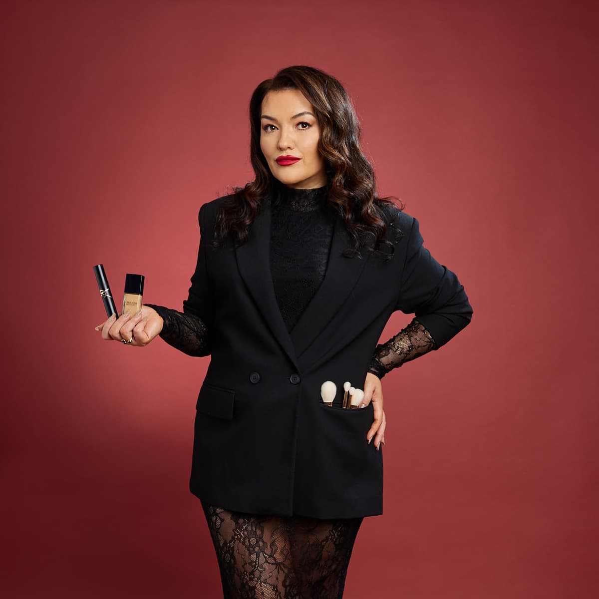 Using advanced complexion techniques and premium professional products, the makeup is crafted with precision to achieve radiant, sculpted, and beautifully balanced skin that photographs flawlessly while still looking effortless in person.