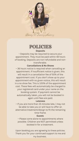 When booking, you will need to enter your card details - this is not for payment, the details are kept incase the card needs to be charged in accordance to my cancellation/no-show policy.