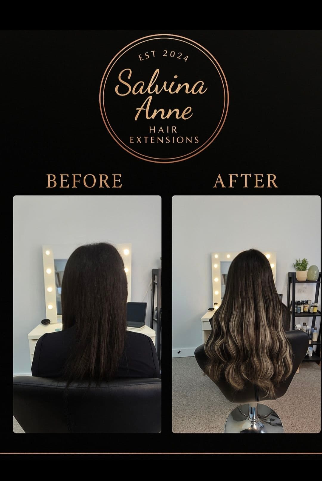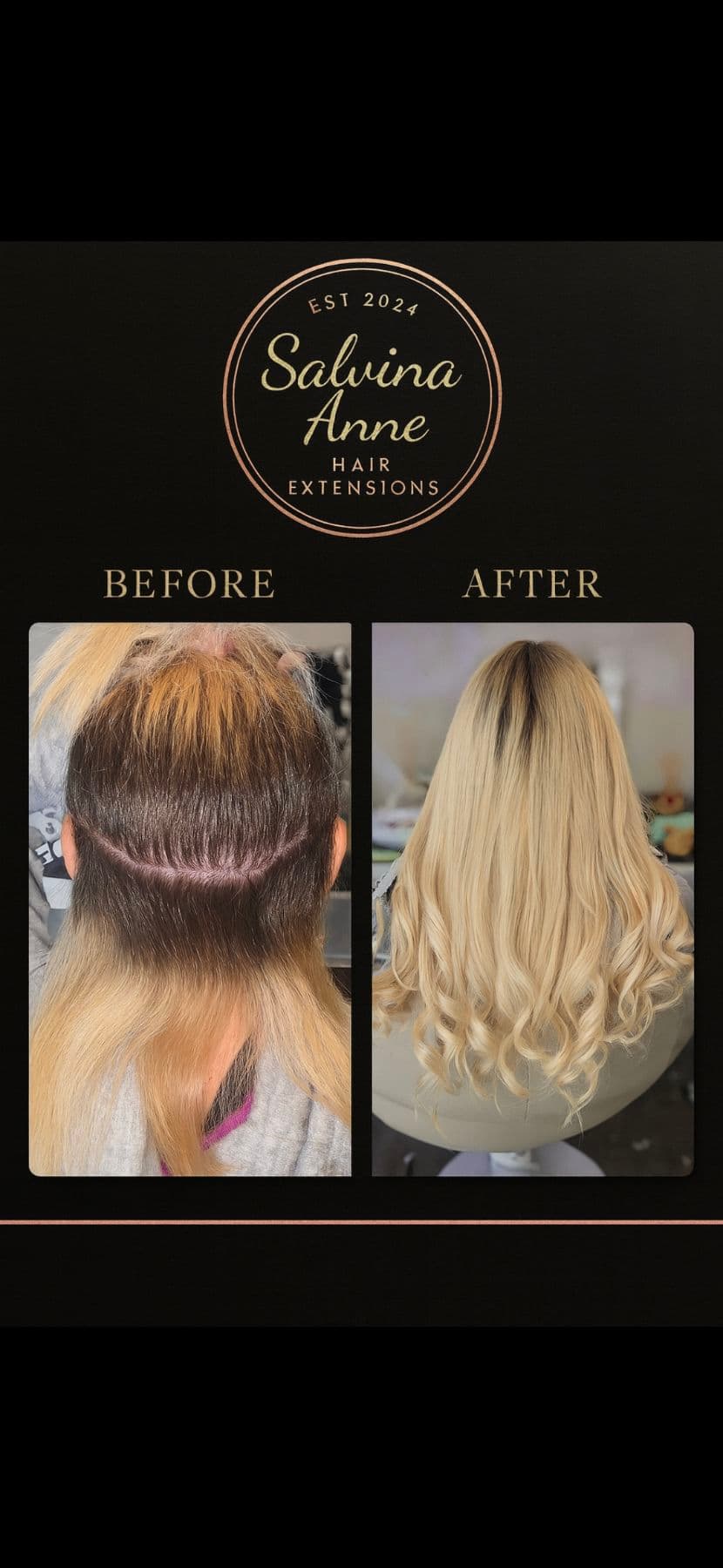 Hi, I’m Samantha, the founder and educator behind Salvina Anne Hair Extensions — a name that represents strength, growth, and everything I’ve poured my heart into. My passion for hair began when I first got extensions at sixteen. I instantly fell in love with how they made me feel — confident, feminine, and complete. But I also realised something important: most clients weren’t being fully educated on the different methods, maintenance, or proper aftercare. That discovery sparked my mission to do things differently. Since I was seventeen, I’ve personally struggled with slow hair growth, so I know exactly how it feels to want long, healthy, beautiful hair that still feels like your own. That personal journey inspired me to create a space where women could feel educated, cared for, and genuinely understood. At Salvina Anne Hair Extensions, I specialise in luxury Weft and Tape methods, offering a tailored experience that’s one-on-one, relaxed, and built on trust. Every detail matters — from the consultation to the final blend — because your confidence is at the heart of what I do. Beyond my client work, I’m passionate about training students who are eager to master the art of hair extensions. Through my Signature Training Programs, I teach hands-on techniques, product knowledge, and the professional standards that define the Salvina Anne approach — helping the next generation of stylists build confidence and skill. Salvina Anne Hair Extensions was born from passion, experience, and the belief that beauty is deeply personal. Here, it’s not just about changing how you look — it’s about how you feel. Luxury. Glam. Confidence. Always.